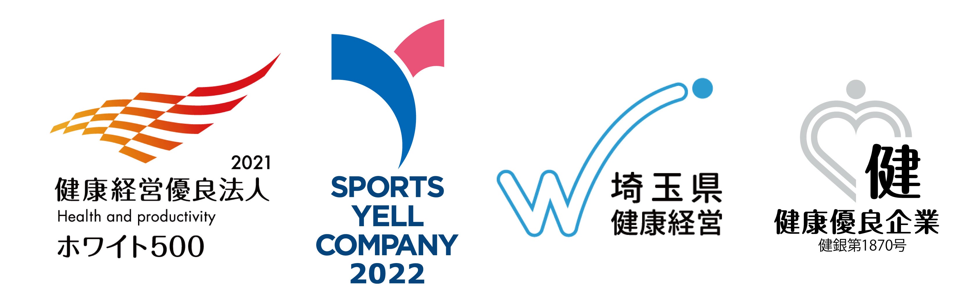 弊社の健康経営への取り組みに対する評価として、経済産業省と日本健康会議が共同で選出する「健康経営優良法人(大規模法人部門)」、スポーツ庁が認定する「スポーツエールカンパニー」、本社所在地である埼玉県が認定する「埼玉県健康経営実践事業所」、および健康保険組合連合会 東京連合会が認定する「健康優良企業「銀の認定」」を取得しています。