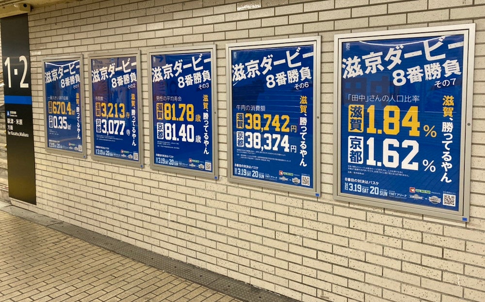 この滋京ダービーPRポスターは、滋賀県内にあるJR41駅に掲示されます。※掲示枚数、種類は駅によって異なります