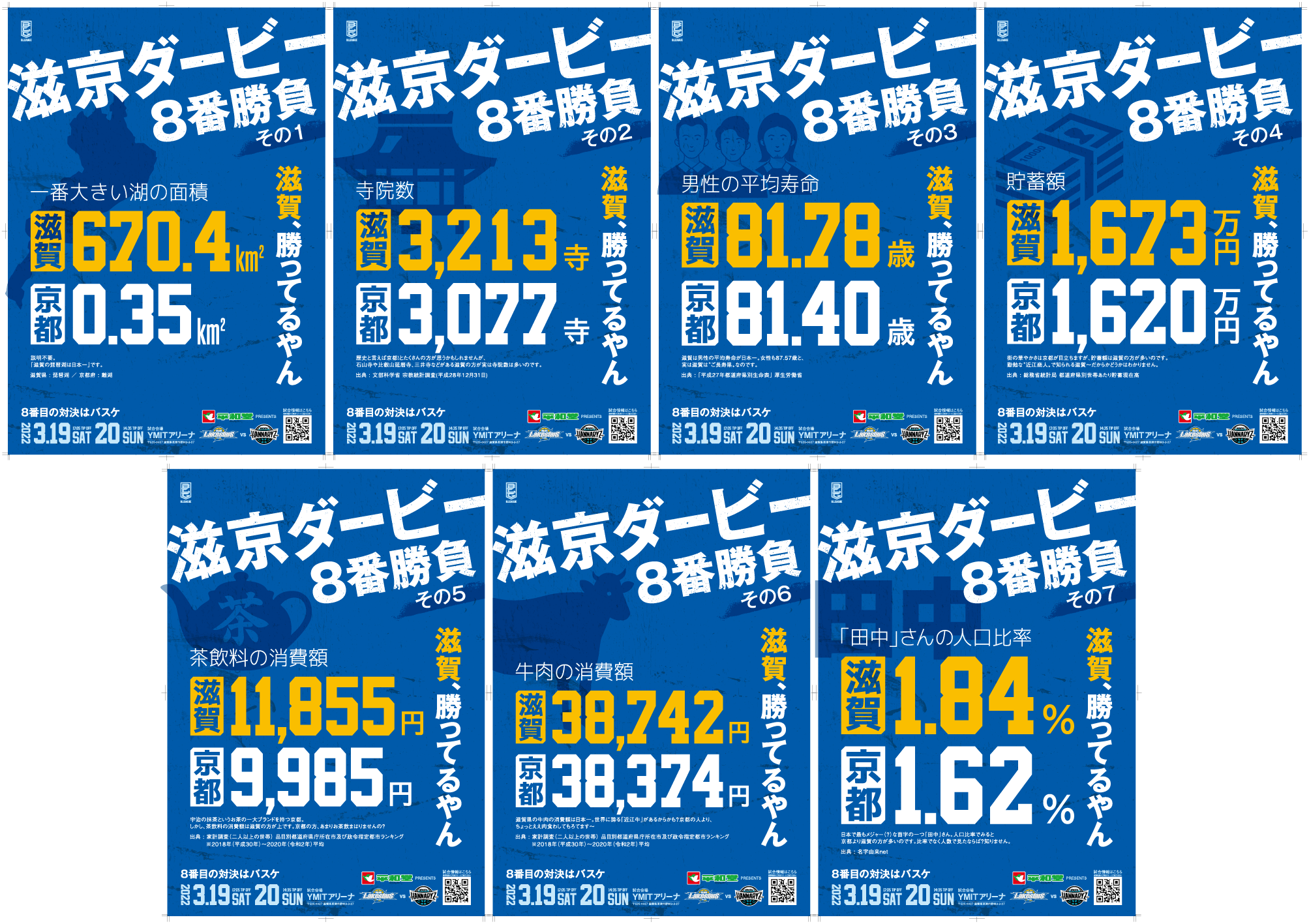 今回の滋京ダービーを盛り上げるために、〝滋賀人の誇りと勝利への渇望〟にスイッチを入れるために、とにかく滋賀が京都に勝っているものを集め、7パターンのポスターデザインに表現いたしました。