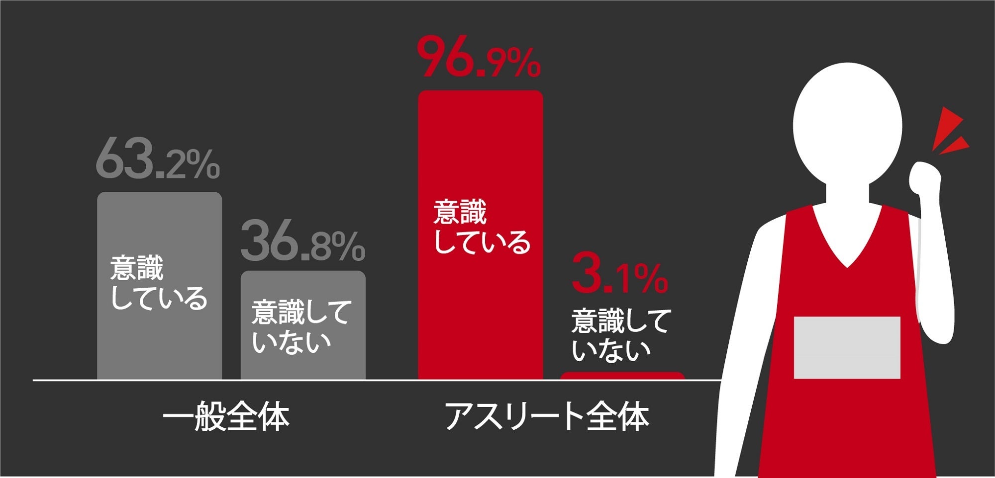 続いて、スポーツを実施するにあたり「シューズのインソール」に対する意識を調査。一般はその重要性を意識しているのは6割以上(63.2%)に対し、アスリートは9割以上(96.9%)という結果に。アスリートにとって「シューズのインソール」は非常に重要なスポーツギアになっていることがうかがえます。