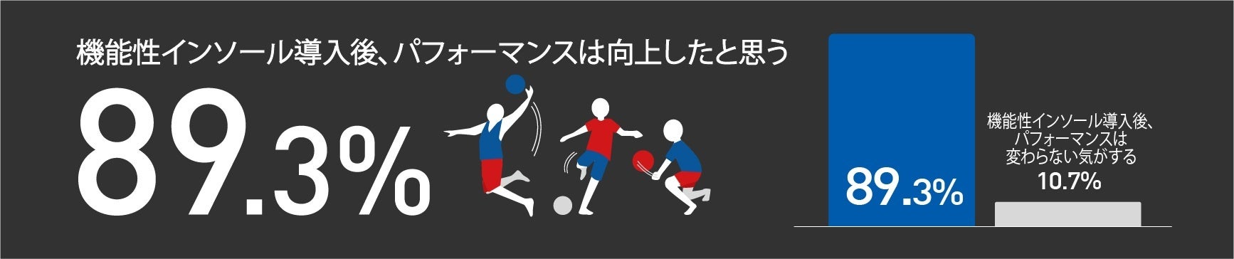| アスリートの約9割(89.3%)が機能性インソールの導入によりパフォーマンスが向上したと回答! 「足裏の踏ん張り・身体の安定感・疲労軽減」を実感する選手が多数! |