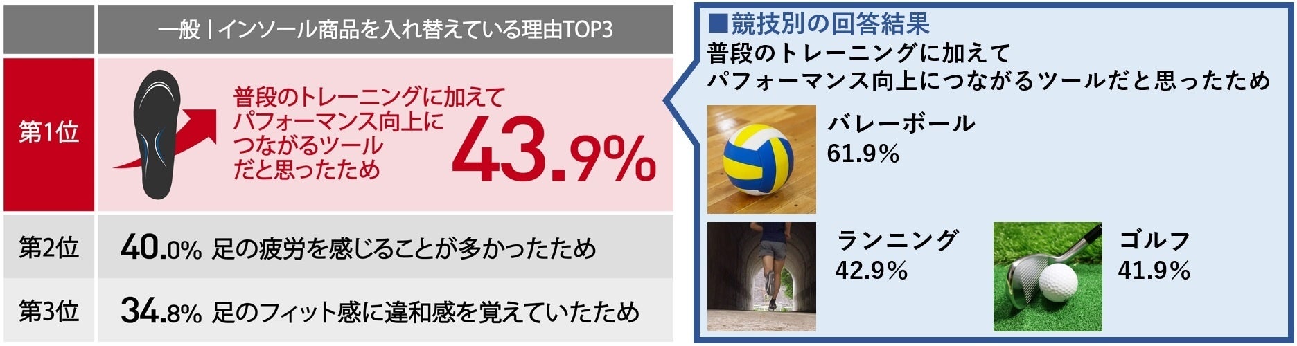 次に、インソール商品を入れ替えてシューズを履いている一般(164名)に対し、別途インソール商品を購入された理由を調査。「普段のトレーニングに加えて、パフォーマンス向上につながるツールだと思ったため(43.9%)」が理由として最も多くなる結果となりました。また、この理由を回答した方の競技別の傾向を見てみると、バレーボールを行っている方が最もポイントが高くなりました。