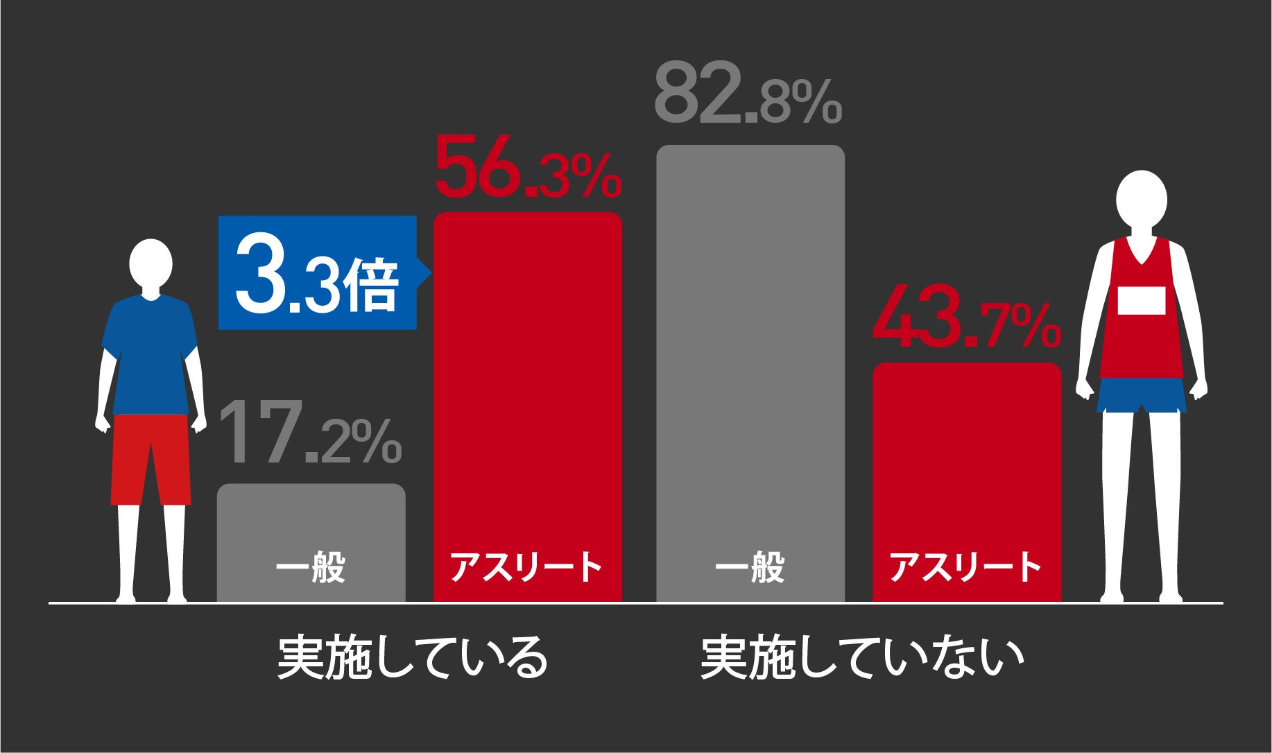 | アスリートの半数以上(56.3%)が足裏トレーニングを実施! 一般はその重要性を半数以上(52.8%)が理解しつつも、実施者は1割(17.2%)に留まる。 |