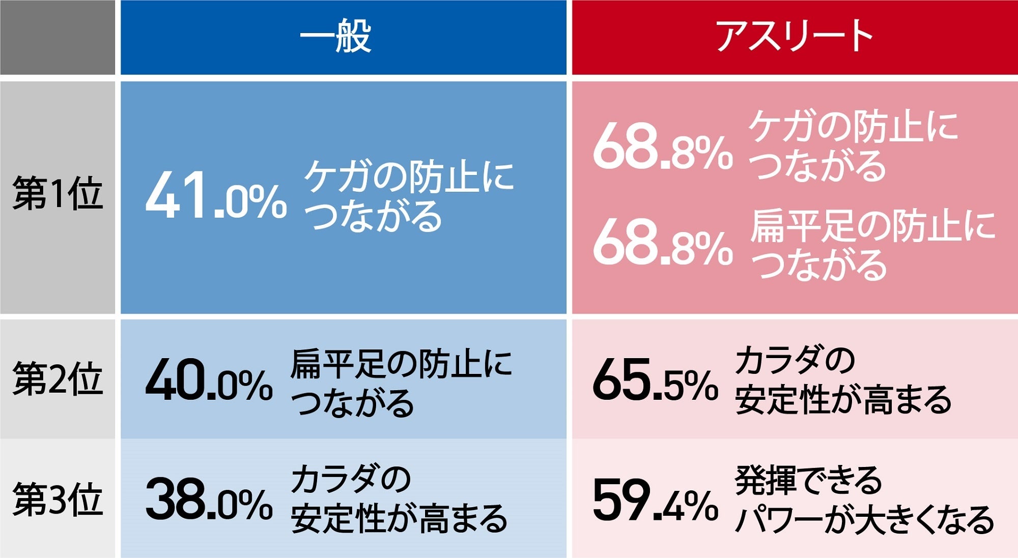 「一般スポーツ実施者(以下、一般)」と「アスリート」に対し、スポーツのパフォーマンスに「足裏のトレーニング」が影響を及ぼすことの認知を伺うと、一般が52.8%に対し、アスリートは75.0%という結果に。また、足裏トレーニングが及ぼす具体的なメリットを問うと、両者共に、ケガや偏平足の防止につながるトレーニングであるという理解が上位に。障害の防止に繋がるという事に加え、アスリートでは「発揮できるパワーが大きくなる(59.4%)」という点もトップ3にランクインしました。