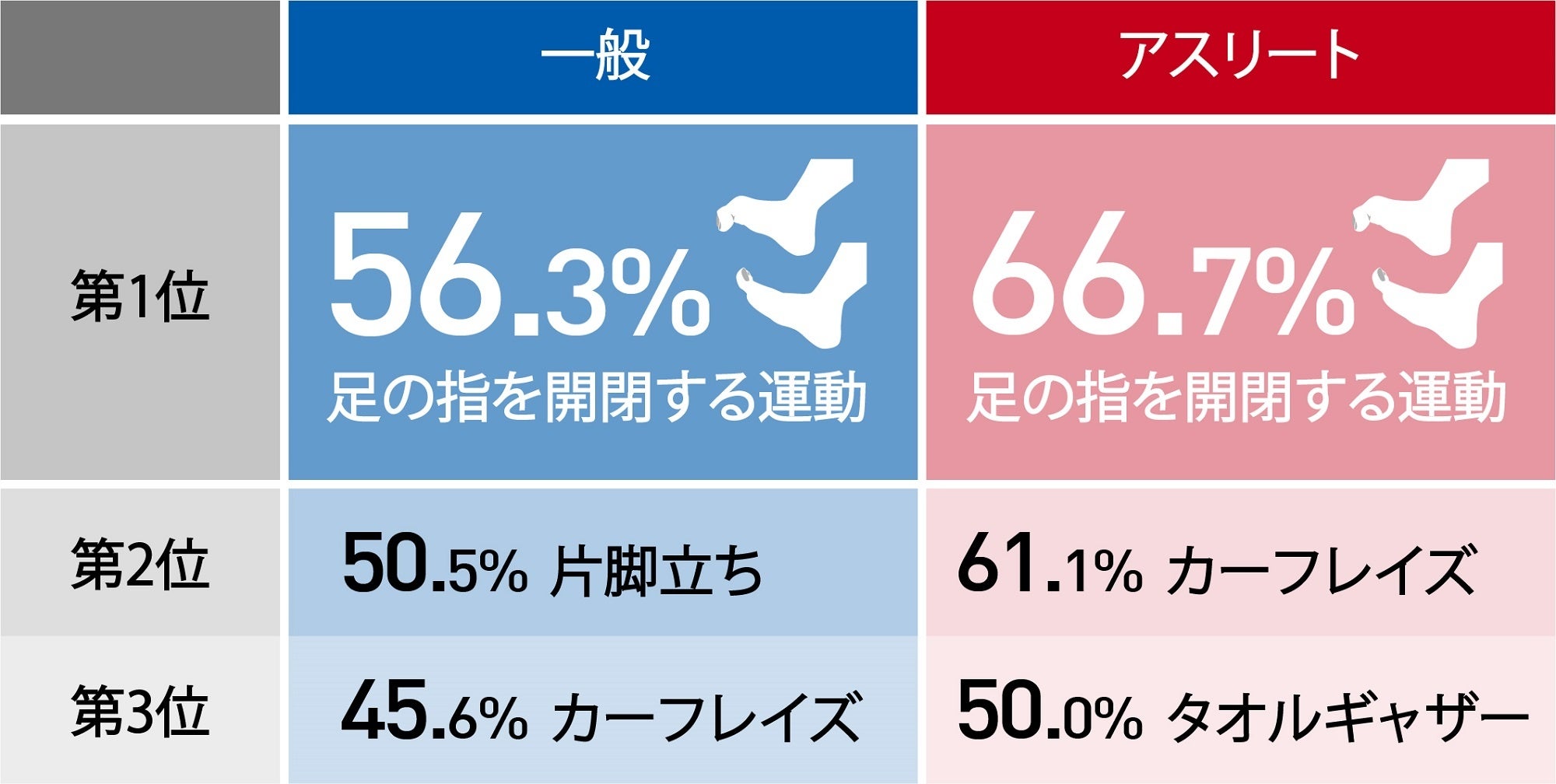 次に、一般とアスリートに対し「足裏トレーニング」の実施状況を問うと、一般は17.2%に対し、アスリートの半数以上(56.3%)が実施していることが分かりました。一般は、足裏トレーニングがパフォーマンスに及ぼす影響を半数以上が認知しつつも、多くはその実施には至っていない状況でした。足裏トレーニングを実施している一般(103名)とアスリート(18名)に、どのようなトレーニングを行っているか調査。両者ともに「足の指を開閉する運動」が第1位に。その他、「カーフレイズ(壁に手をつきながら、つま先立ちし、かかとを上下に動かす運動)」も両者上位にランクインする結果となりました。