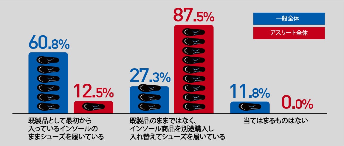 次に、普段スポーツを行う際の「シューズのインソール」について伺うと、アスリートの約9割(87.5%)が、「既製品のままではなく、インソール商品を別途購入し入れ替えてシューズを履いている」ことが分かりました。一方、一般については「既製品として最初から入っているインソールのままシューズを履いている」という方が6割(60.8%)となり多数に。アスリートは、一般と比較するとインソールというスポーツギアにこだわりを持っている選手が多いことが分かります。