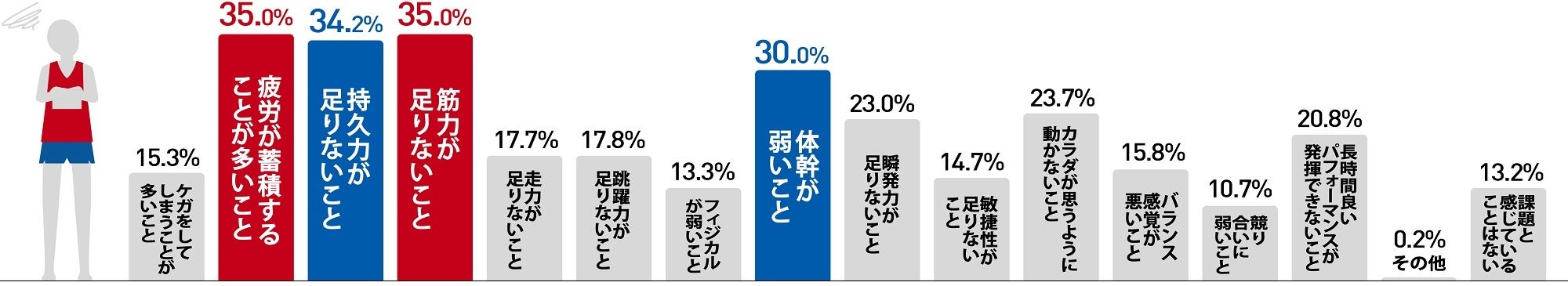 最後に、一般(600名)に対し、スポーツを普段行っている中で感じている課題・改善点について調査。「疲労が蓄積することが多い(35.0%)」と「筋力が足りないこと(35.0%)」が同率で第1位。次いで、第2位「持久力が足りないこと(34.2%)」、第3位「体幹が弱いこと(30.0%)」という結果となりました。