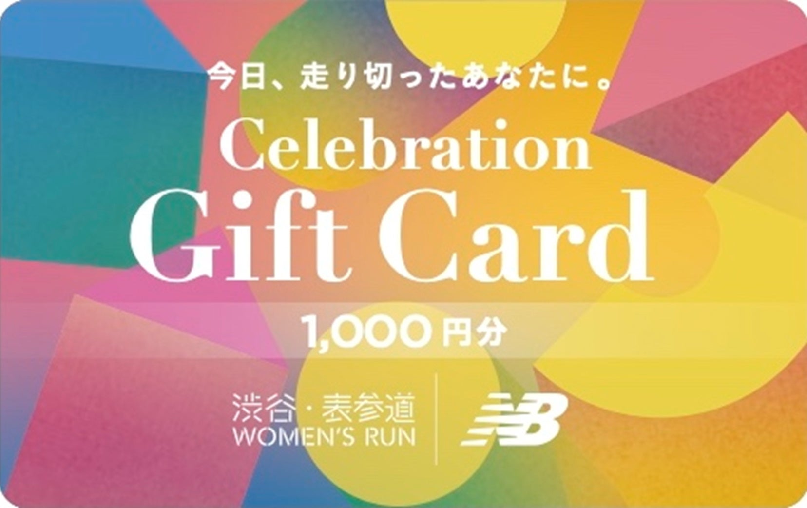 走った後も渋谷・表参道の街を楽しんでほしい、という想いから、ニューバランスの会員サービス「myNB」会員に登録されたランナーの皆さまに「セレブレーションギフトカード」をプレゼント。渋谷・表参道エリアの数々の賛同店舗で使用できる1000円分のギフトカードです。渋谷PARCO、渋谷ヒカリエ、SHIBUYA CAST.、MIYASHITA PARK等の一部店舗にて、ご利用いただけます。「セレブレーションギフトカード」は大会当日に会場内に設置された「セレブレーションギフトカード引換えブース」にてプレゼント。