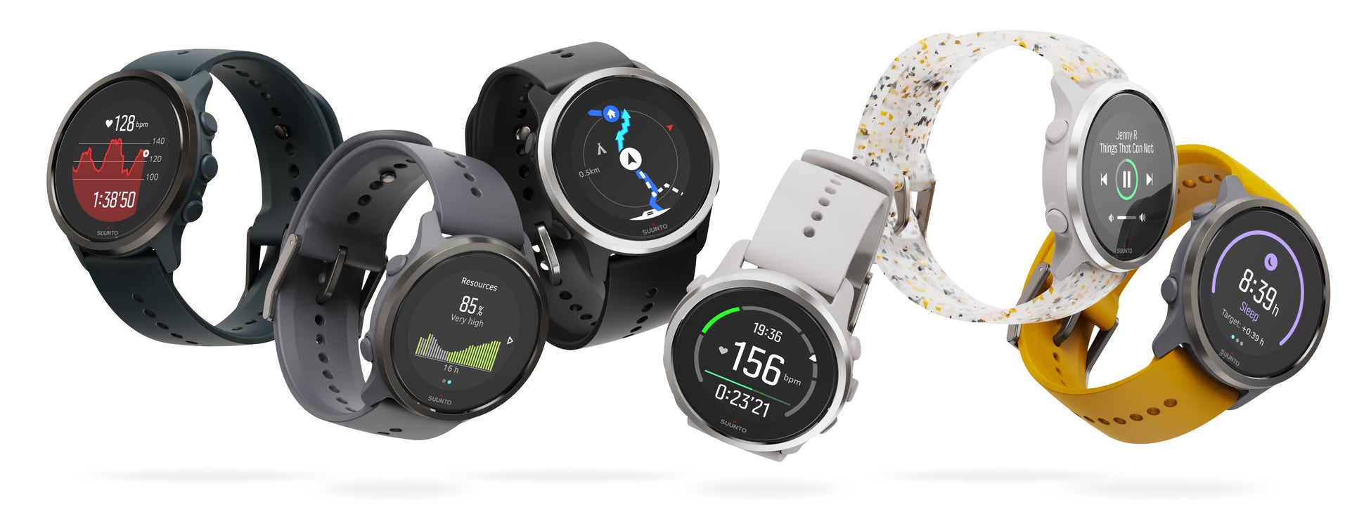 手首式心拍数、80以上のスポーツモード、Suunto Plus™ に対応、ルートナビゲーション、歩数、カロリー、回復を追跡、睡眠の質と持続時間を測定