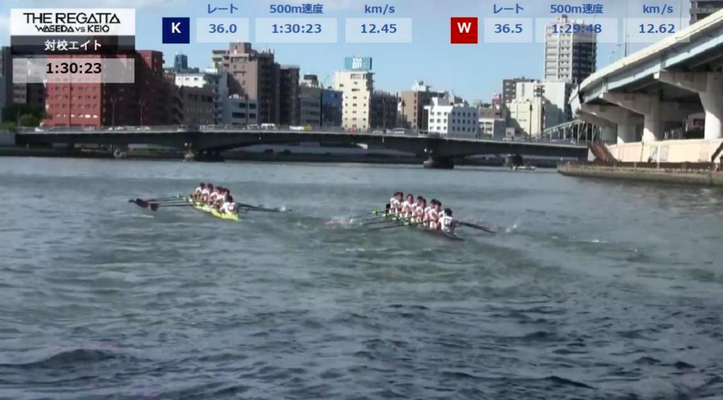 ・両校艇のレート(1分間に漕ぐ回数)、速度をリアルタイム表示