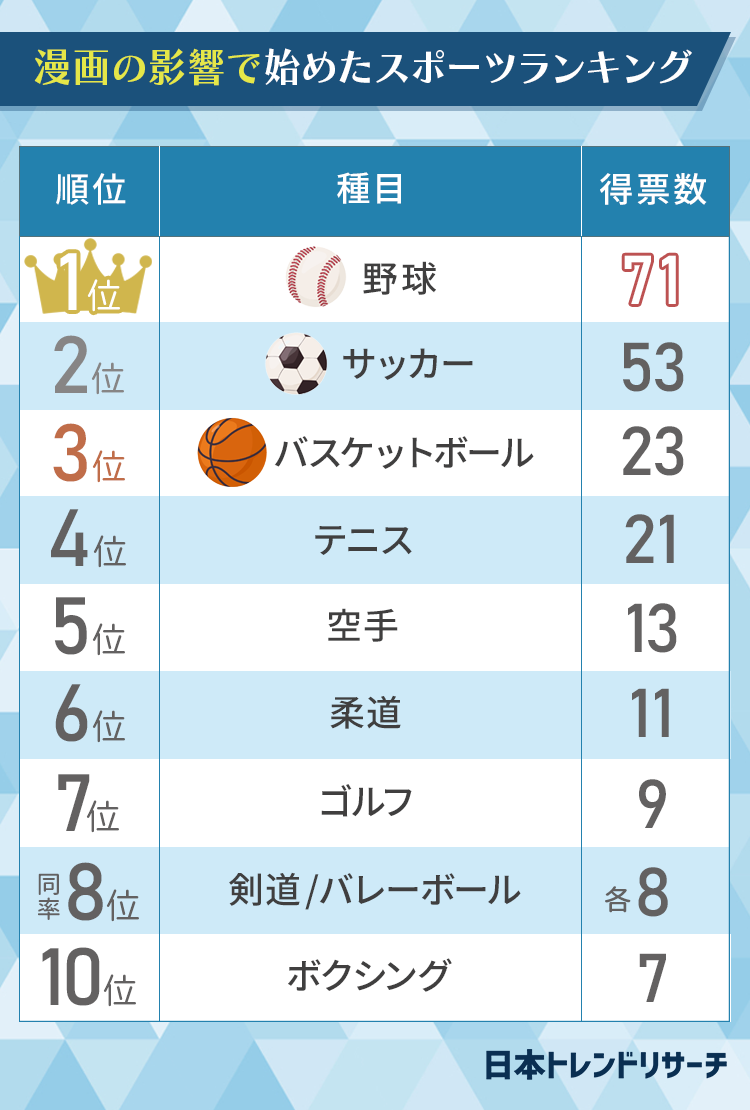 一方で40代以下の方は「サッカー」「バスケットボール」「テニス」を始めた方が多く、「キャプテン翼」「スラムダンク」「テニスの王子様」などの影響を大きく受けていました。
