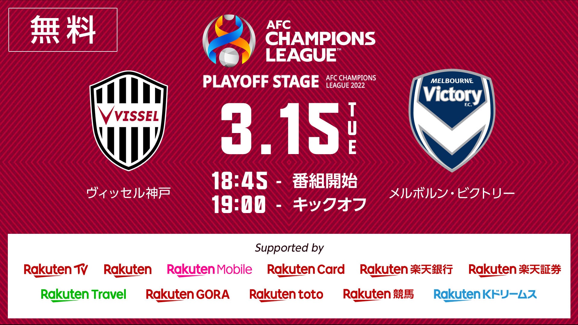 楽天グループ株式会社が運営する動画配信サービス「Rakuten TV」は、3月15日(火)19:00より「神戸市御崎公園球技場」にて開催される、AFCチャンピオンズリーグ(以下「ACL」)2022の東地区プレーオフステージ「ヴィッセル神戸 vs. メルボルン・ビクトリー」を国内で独占無料生配信します。