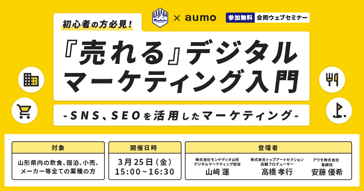 モンテディオ山形とアウモが連携する取り組みのスタートとして、2022年3月25日に、山形県内の飲食店や宿泊施設、観光施設の運営企業向けに「『売れる』デジタルマーケティングセミナー入門 -SNS、SEOを活用したマーケティング-」を実施します。