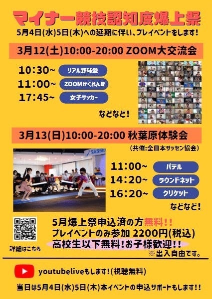 「マイナー競技認知度爆上祭」は、50以上の「マイナースポーツ」が集まるスポーツの祭典で、ファン獲得、普及、立ち上げなど、認知度向上を目的として競技が出展し、体験会や説明会を通じてだれでも楽しめるイベントです。当初3月に実施予定だったイベントが5月へ延期となったことに伴い、プレイベントが実施されることとなりました。