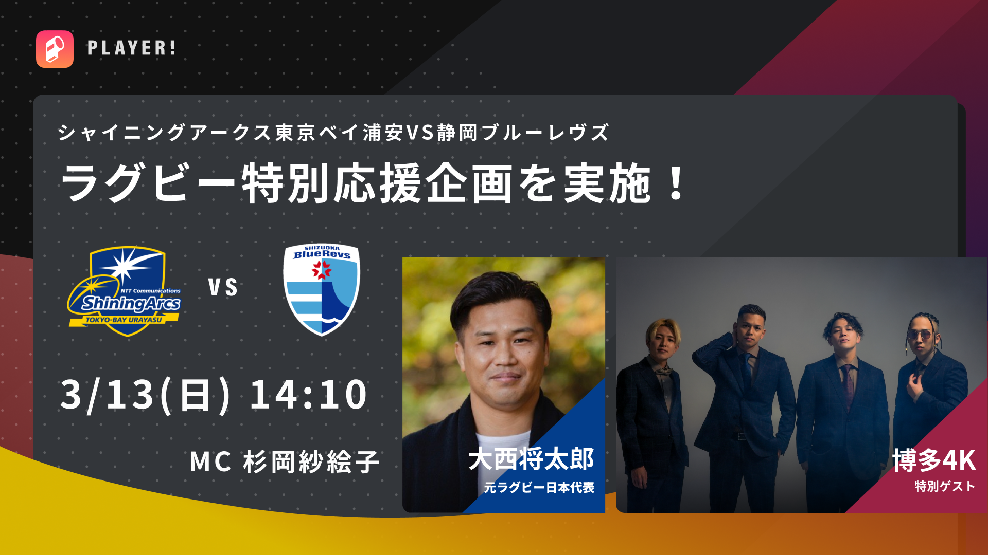 スポーツエンターテイメントアプリ「Player!」は、NTTジャパンラグビー リーグワンの第9節、シャイニングアークス東京ベイ浦安vs静岡ブルーレヴズの特別応援企画を3月13日(日)14:10より配信いたします。元ラグビー日本代表の「大西将太郎」さん、アーティストの博多4Kさんをお招きして、シャイニングアークス東京ベイ浦安vs静岡ブルーレヴズの一戦を盛り上げます。