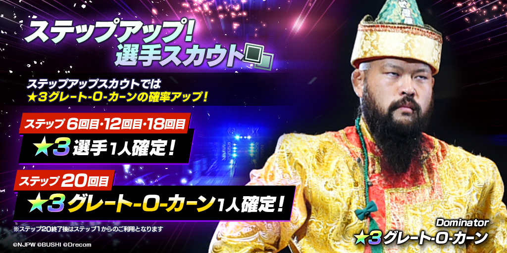 グレート-O-カーン選手参戦を記念して「選手スカウト」にて、新日SS初のステップアップ選手スカウトを開催中。