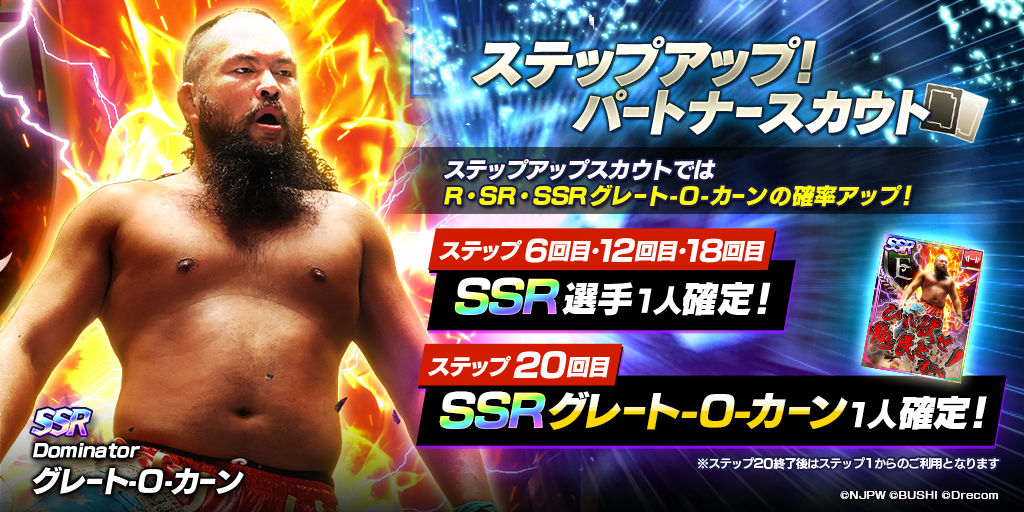 ゲーム内ではグレート-O-カーン選手参戦に伴い「選手スカウト」と「パートナースカウト」にて、新日SS初のステップアップスカウトも開催中しております。