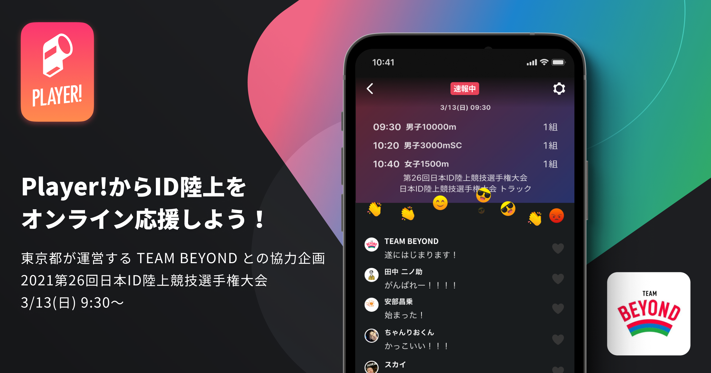 スポーツエンターテイメントアプリPlayer!は、パラスポーツを応援する人を増やす東京都のプロジェクト「TEAM BEYOND」と連携し、「南総通運 WPA公認 2021第26回日本ID陸上競技選手権大会」を3月13日(日)9時30分から全種目結果速報いたします。また、当日は試合映像とともに、増田明美さんの場内解説をPlayer!からもお楽しみいただけます。Player!からID陸上を応援しましょう!