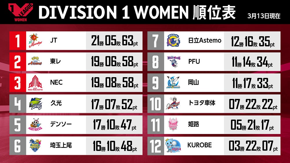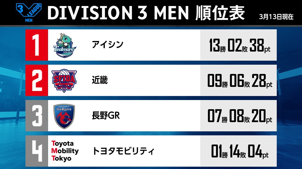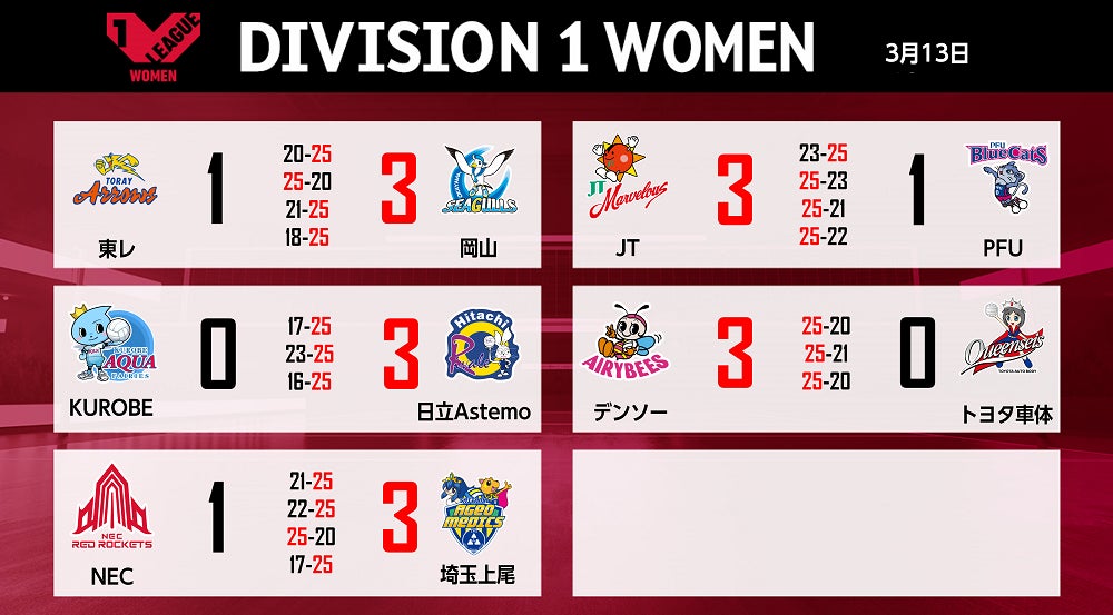 バレーボール国内最高峰リーグ V.LEAGUE【3月13日の試合結果】