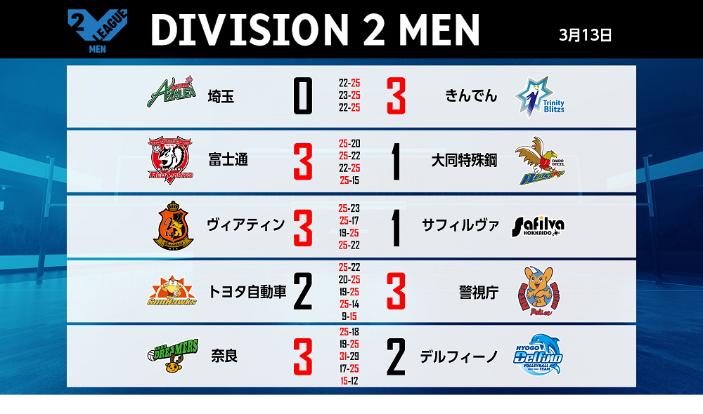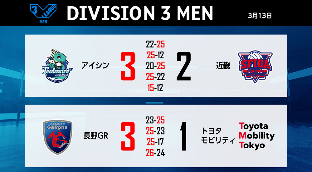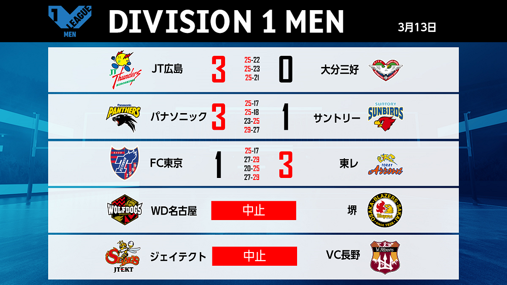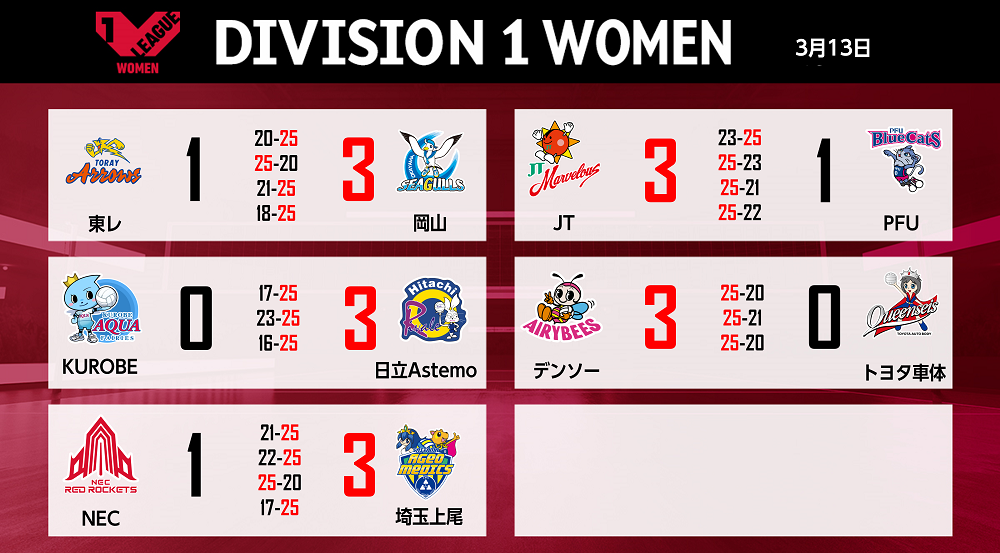 バレーボール国内最高峰リーグ V.LEAGUE【3月13日の試合結果】