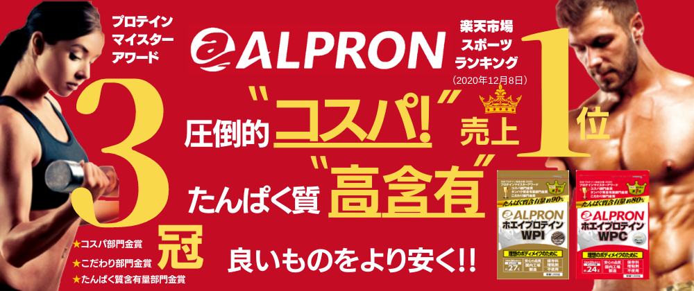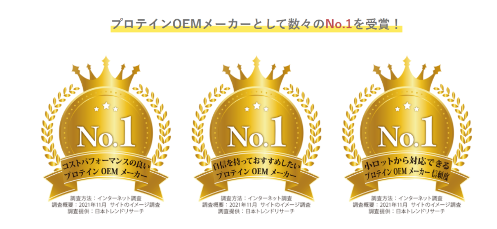 アルプロンは創業20年のプロテインメーカーとして長年プロテインの製造・販売を行ってきました。島根県に自社工場を保有しており、自社ブランド(PB)と同時にOEM受託をしてきて300品目以上の実績とノウハウを蓄積してきました。その結果、以下の3項目で1位を獲得しました!