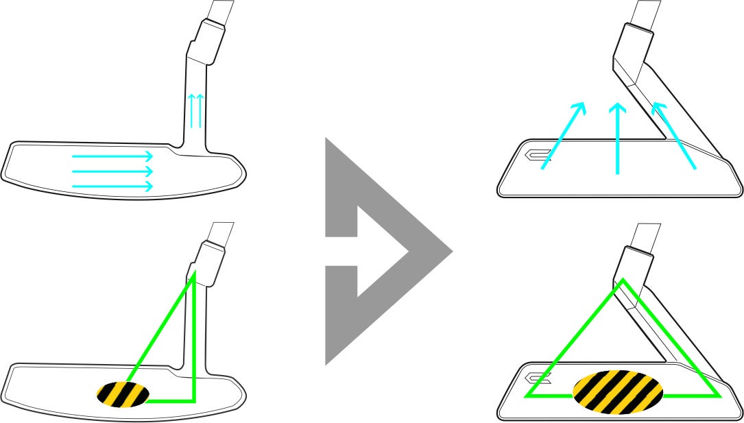 マレット型で独自の三角構造を採用しました。シャフトをセンター置くことでトゥとヒールの安定したバランスを保ったまま、直進性高いストロークができるようになりました。