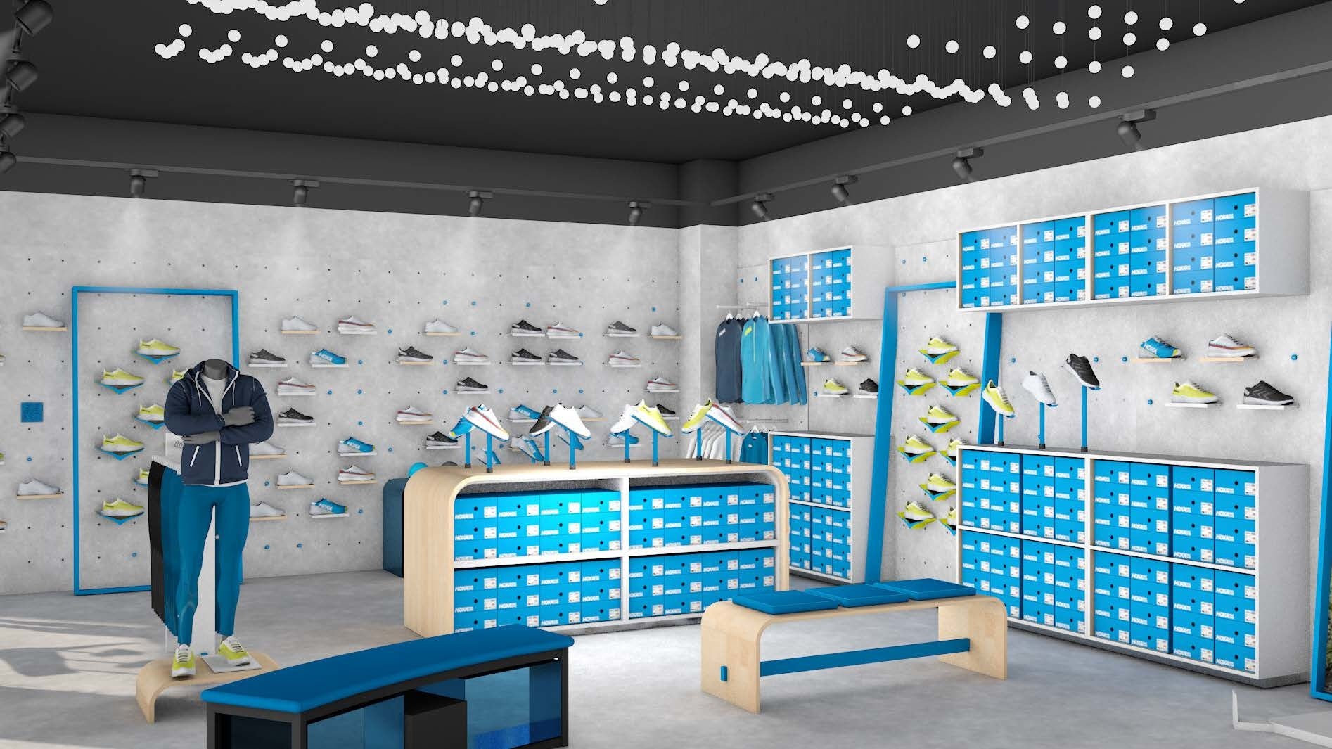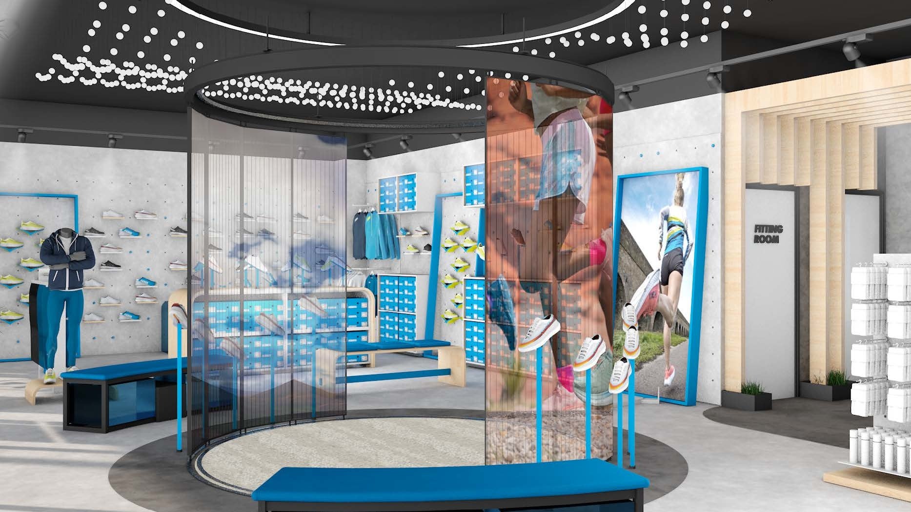 ・店内の中央には、シューズの試走ができるトレッドミルを設置。トレッドミルの脇には最先端LEDモニターが設置され、外側にブランドビジュアルが投影されています。