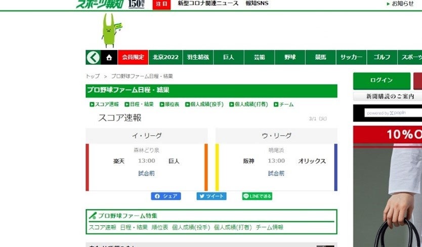 2022年はウエスタン・リーグが3月18日に、イースタン・リーグが19日に開幕します。明日のスター選手を目指して若手選手が毎日、火花を散らす戦いを繰り広げていますが、生の情報はなかなか手に入りません。スポーツ報知ではイースタン、ウエスタンの公式戦全試合の「今」をお届け!途中経過だけでなく、1軍と同様の1球速報をお届けします。