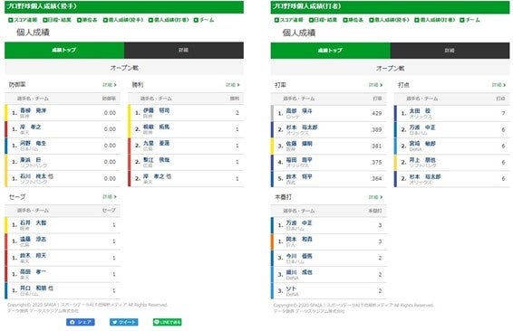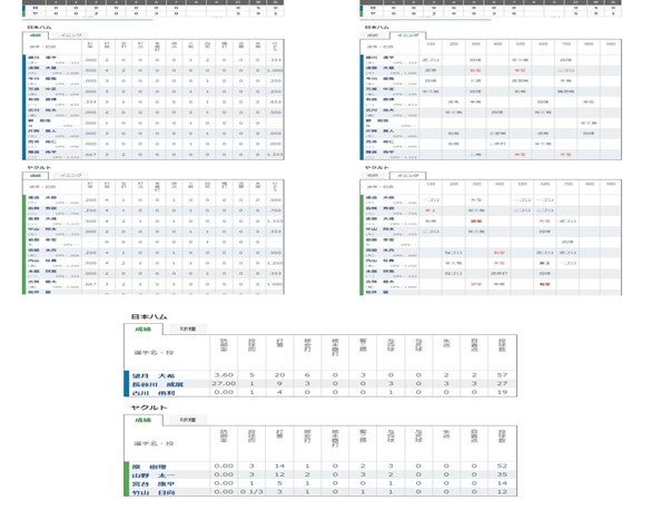 1球速報で生の打席を追いかけられるだけではありません。お気に入りの選手の全打席結果や、チーム成績を投手・野手別で紹介します。