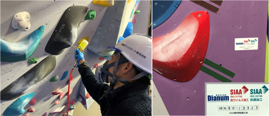 そしてこの度、葛飾区より運営管理を任されている水元公園の総合クライミング施設「東金町運動場 スポーツクライミングセンター」内のクライミングウォール・ホールドに対して、抗菌コートの施工を行いました。
