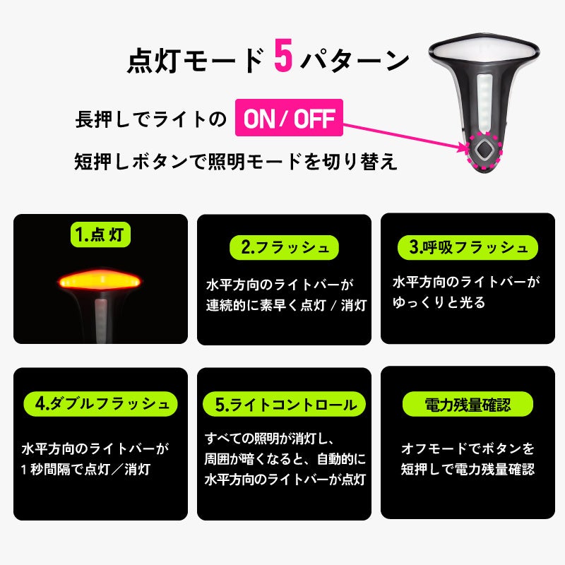 ・点灯モードは5パターン。ボタンを長押しでライトのON/OFF。