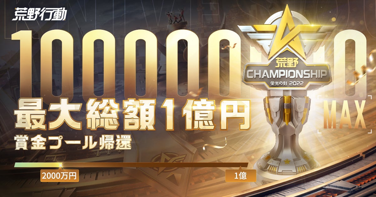 去年に続き、「2022荒野CHAMPIONSHIP-栄光の刻(とき)」では、最大総額1億円の賞金プール支援イベントが再びに実施することとなりました!3/20よりすべての荒野行動ユーザーがゲーム内からイベントに参加することが可能です。全荒野ユーザーの力を合わせて、荒野CHAMPIONSHIPの参戦チームに最大レベルの賞金を積み上げていきます!