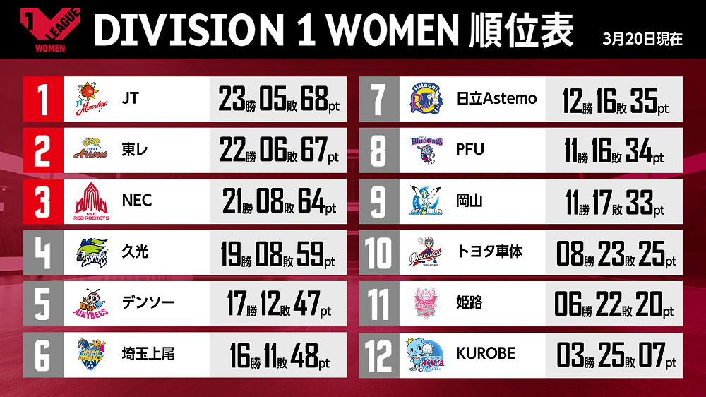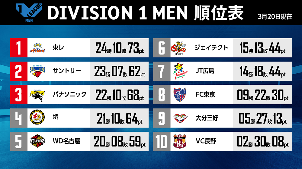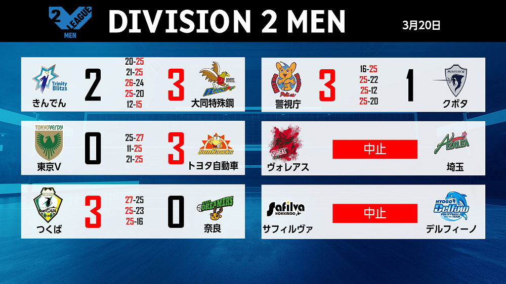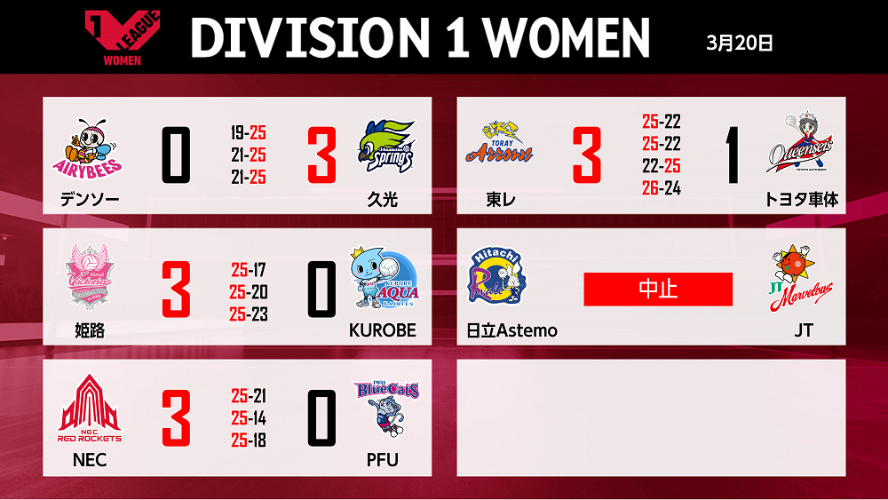 バレーボール国内最高峰リーグ V.LEAGUE【3月20日の試合結果】