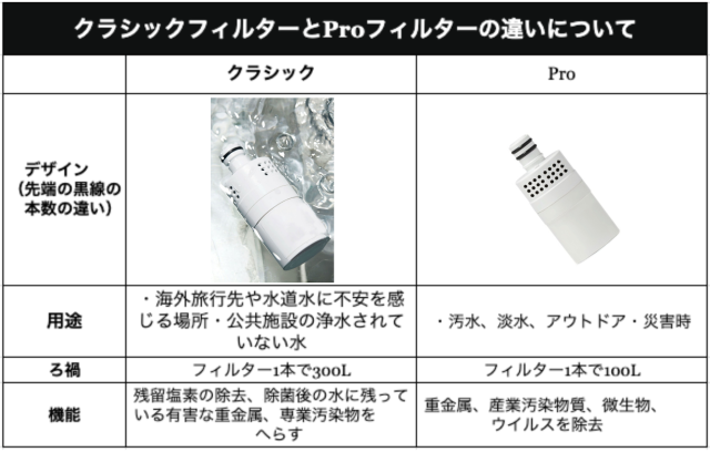 フィルターは場面に合わせてチョイスできるように、普段使い用とアウトドアや災害用とに分かれています。