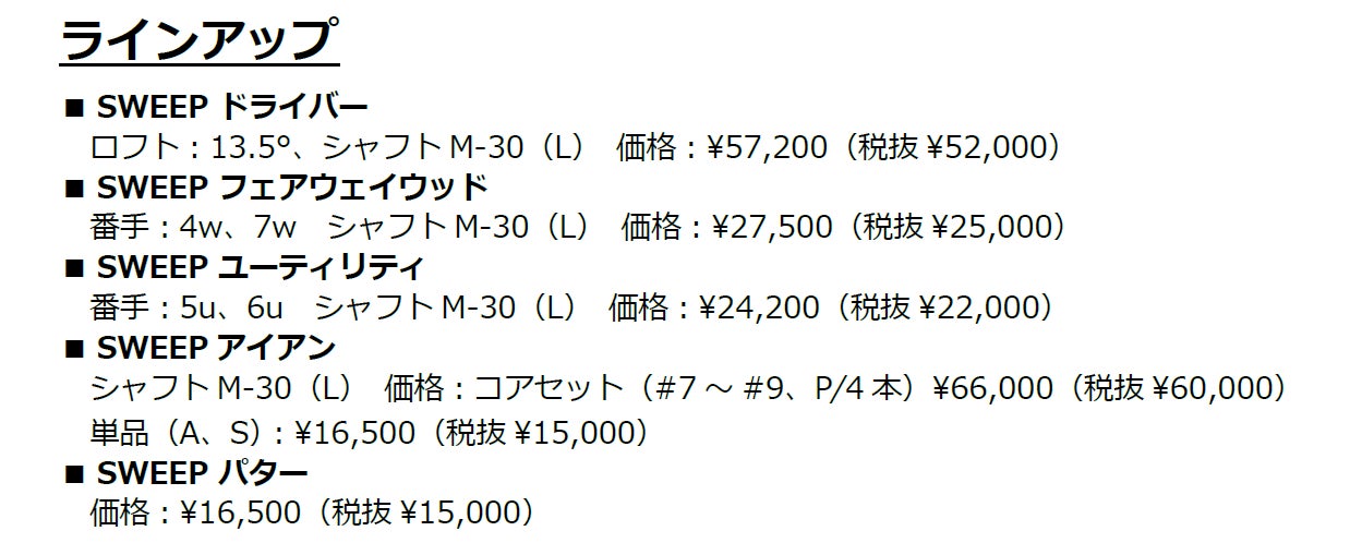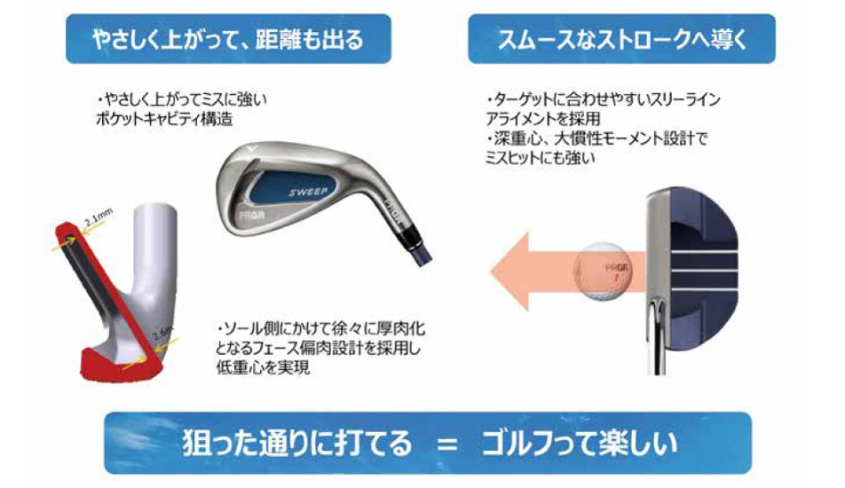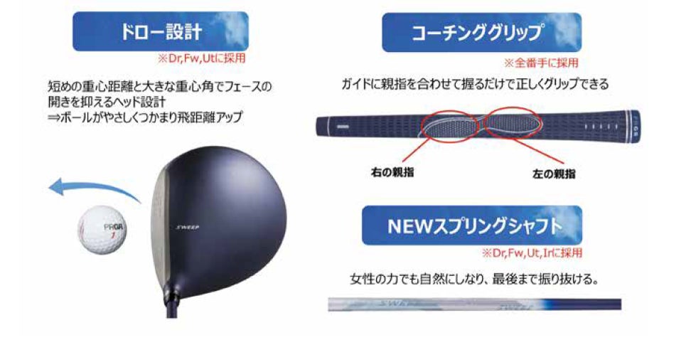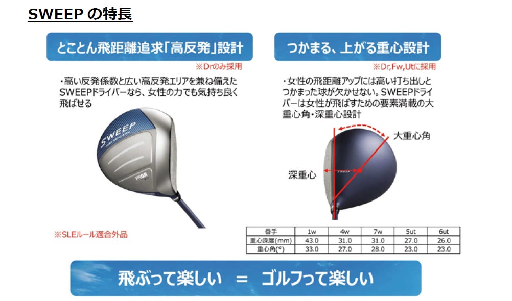 (株)プロギアは、ヘッドスピード30m/s 前後の女性専用設計のクラブシリーズ「SWEEP(スイープ)」をフルモデルチェンジし、5 月からドライバー、フェアウェイウッド、ユーティリティ、アイアン、パターを発売します。今回は「飛ぶって、楽しい。」をコンセプトに、新たにゴルフを始める女性ゴルファーやさらなるレベルアップを目指す女性ゴルファーがボールを飛ばす楽しさ、狙った通りに打てる楽しさを体感できる機能をそれぞれのクラブに盛り込んでいます。