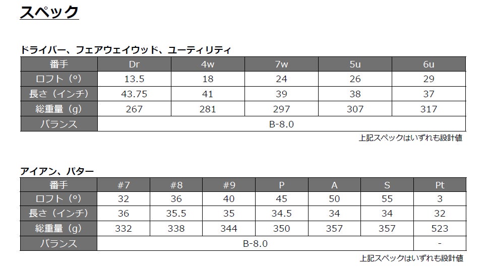 ドライバーはSLE ルール適合外の高反発設計を採用し、女性の力でも気持ちよく飛ばすことができます。また、ドライバー、フェアウェイウッド、ユーティリティは女性の飛距離アップに欠かせない高い打ち出しとドローショットを可能にするため、深重心かつ大重心角設計としました。アイアンはやさしく上がって飛距離も出るポケットキャビティを採用。パターはターゲットに合わせやすいスリーラインアライメントを採用し、スムーズなストロークへ導きます。このほか従来モデル同様、ガイドにあわせて握るだけで正しくグリップできる「コーチンググリップ」や女性の力でも自然にしなり、最後まで気持ちよく振り抜ける「NEW スプリングシャフト」を採用しています。