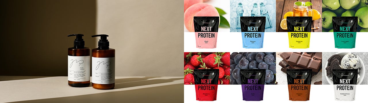 日常のダメージによって空洞化された髪にタンパク質が吸着する事で隙間を埋めて補強し、潤いとハリコシのある髪へと導くNEXT SHAMPOO(ネクストシャンプー)をはじめ、ラインナップは8種類の選べるフレーバーと、1回で約20.5gのホエイプロテインのたんぱく質を効率よく摂取することができ、水でも美味しく、溶けやすいを目指したプロテインです。
