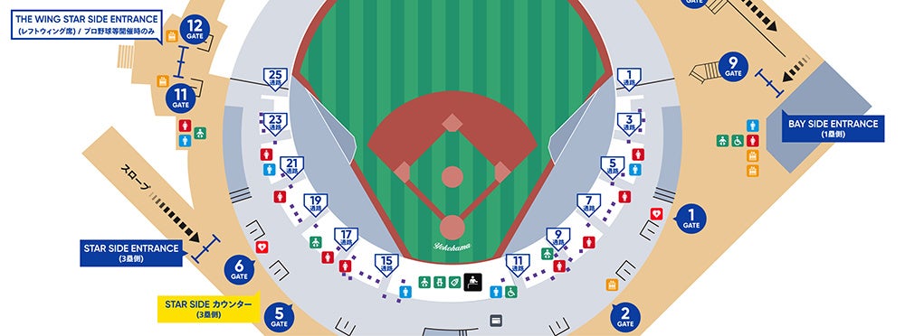 ・横浜スタジアム2Fコンコース内各飲食店舗窓口とトイレ 8ヵ所(計40台。紫の・が設置個所)