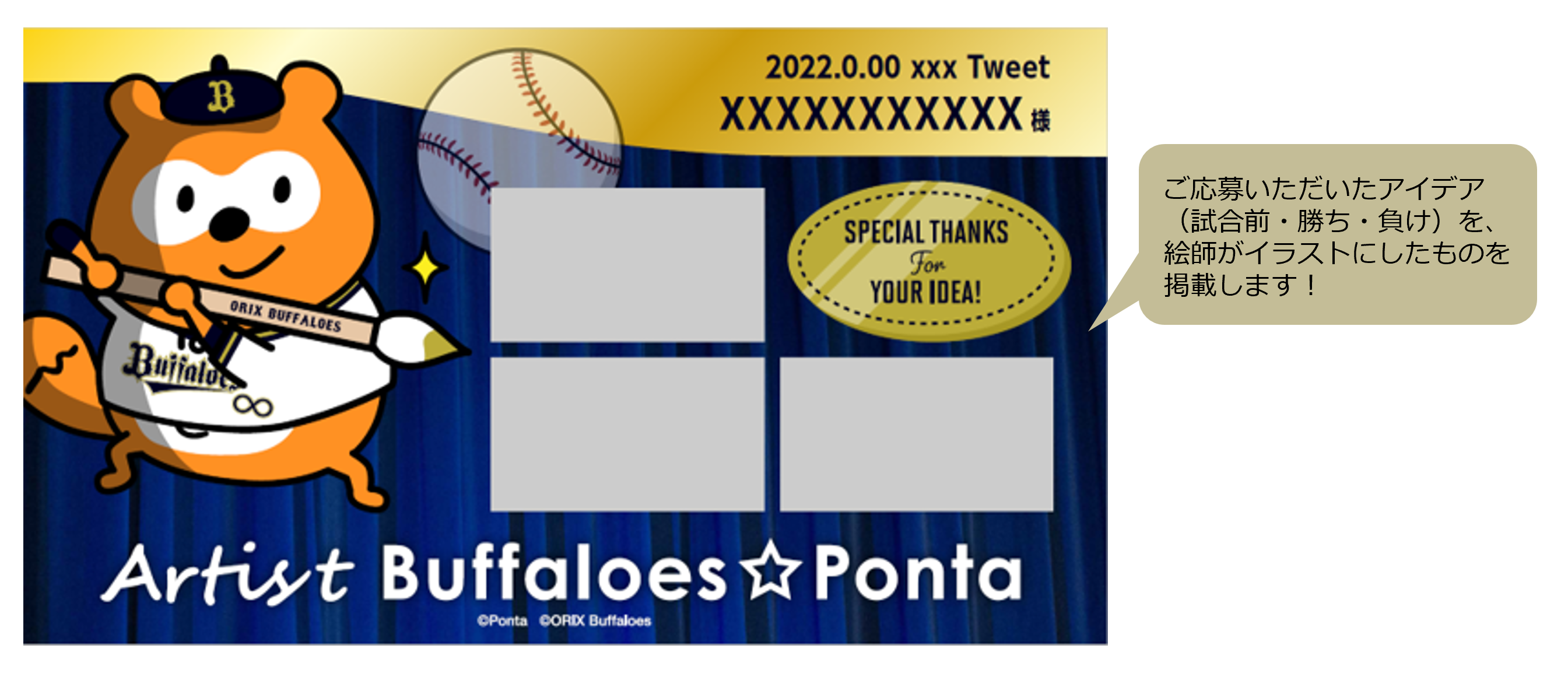 さらに、昨シーズンに続く企画として、2022年3月23日(水)から、バファローズ☆ポンタ公式Twitterアカウントが投稿するイラストのアイデア募集も実施します。アイデアを採用された方には、「特製デジタル壁紙」をプレゼントします。