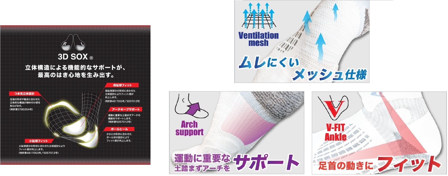 肉体との一体化を追求し、進化するソックス。スポーツを愛する全てアスリートのために、より以上のパフォーマンスと新たな可能性を創造する高機能ソックスブランド。多くのトップアスリートからの意見を取り入れ、ランニング、自転車、クライミング、ゴルフなど競技別に商品を企画開発し、国内外で取得した特許製法「3DSOX」を駆使し、選び抜いた素材、細部までこだわり、自社一貫工場だから出来る本物の日本製の商品です。