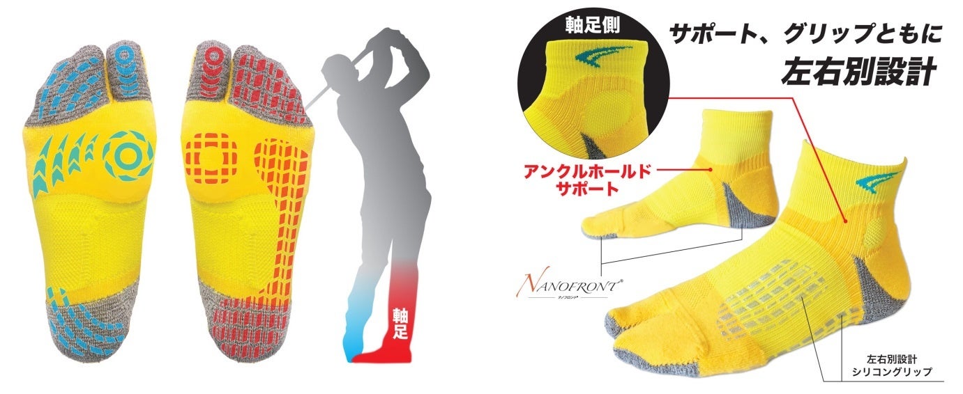今回開発した「FXG042 ゴルフモデル ブーストV2」は、左右完全別設計で3DSOXをベースに軸足を意識したサポートや滑り止め配置が特徴の製品です。