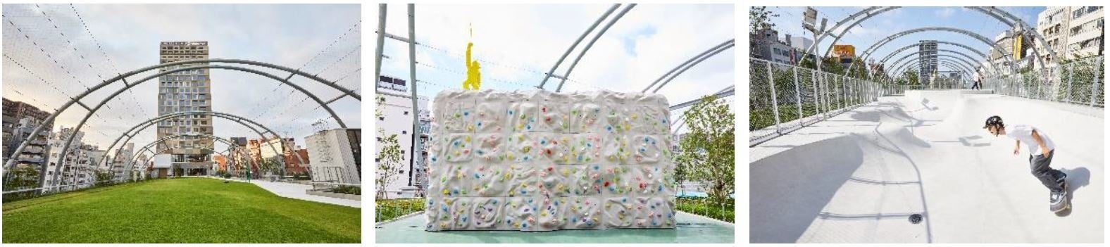 広大な屋上には、200m陸上トラックやテニスコート、東京2020大会で新種目となった3×3のコートを有する「スポーツパーク」や、フットサルコート3面を有する「フットボールパーク」とともに、施設全体で約12,000㎡規模のスポーツの拠点を形成。なお、「スポーツパーク」には家族や仲間たちと思い思いに過ごせる広々とした人工芝エリアを設けるほか、野球・サッカー等のスポーツや映画・音楽コンサートなど、感動を分かち合うパブリックビューイングが開催できる大型LEDビジョンも設置し、幅広い楽しみ方が可能。スポーツを通じて、だれもが健康になるとともに、地域・世代・性別を超えて人と人が触れ合い、つながり、感動を共有できる施設を目指している。