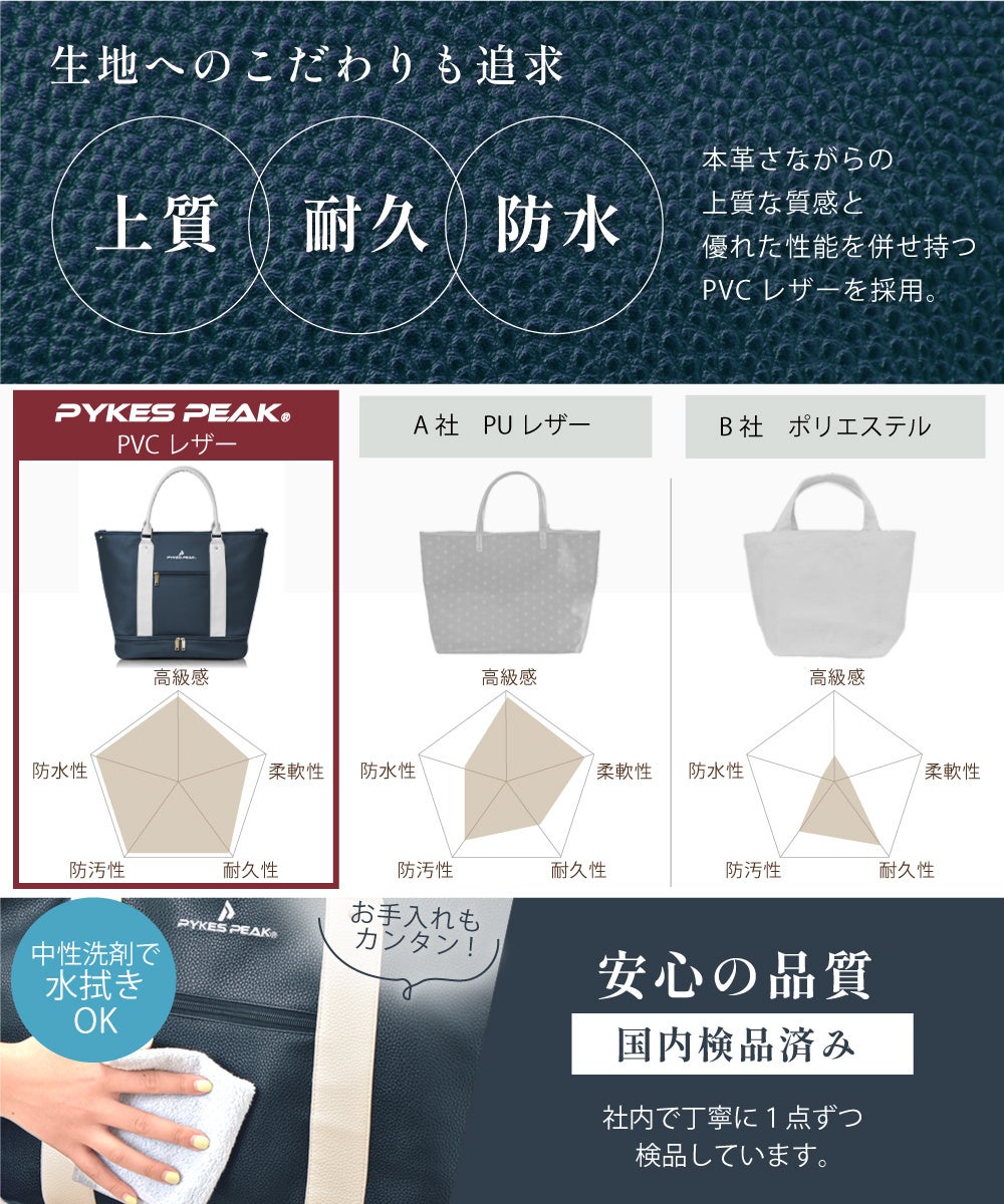 PYKES PEAKゴルフトートのPVCレザーは、高品位な本革そのまま。