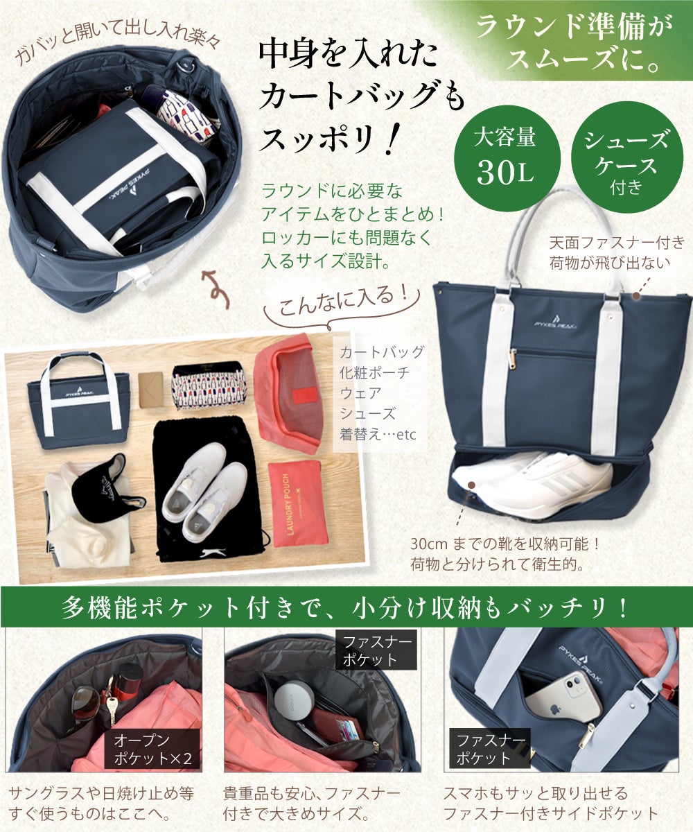 通常サイズのゴルフバッグに入らないキャップや着替え、ゴルフシューズ、スポーツタオル、プレー後の洗面用具や化粧品もこのトートバッグ1つで持ち運びOK。