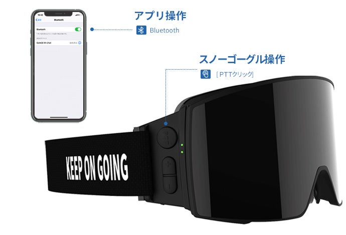 OUNCE R1は無線通信技術を搭載することで、ゴーグルだけでスキー場内1~2kmの範囲内での無線通信が実現しました。スノーボード・スキー中でも仲間たちとゲレンデの積雪状況や滑走感想をその場ですぐ会話出来たり、次はバックカントリーのドロップやキッカーどちらで集合するか合図ができます。