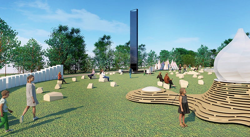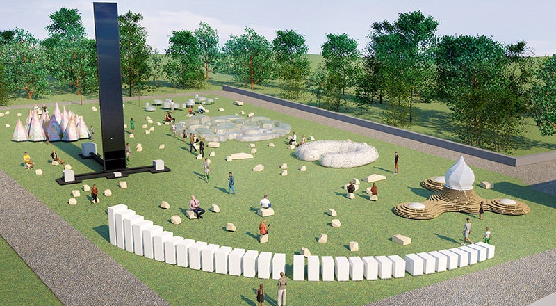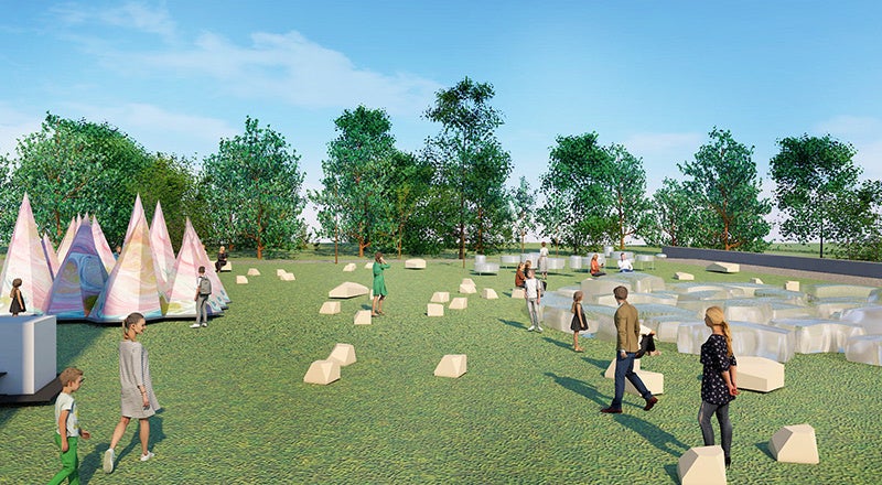 芝生広場には、地球を構成する5 つのエレメント「地」・「水」・「火」・「風」・「空」をテーマに、5組の建築家がプリミティブ(原始的)な遊びをつくりだす「遊具」を出現させます。これらのエレメントと有機的に繋がり合う会場環境もまた、2名の建築家によってデザインされます。人と人、人と自然が繋がり、自然のテクノロジーを体験する遊具を目指します。