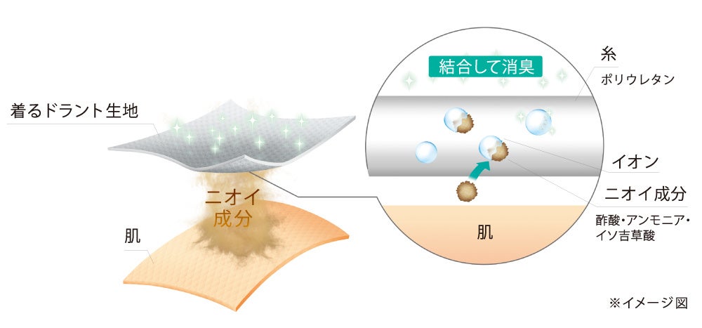 「着るドラント クイックドライ アンダーウエア」に採用しているポリウレタン糸は、中にイオン分子を加工しています。このポリウレタン糸の中にあるイオン分子が汗のニオイ成分である酢酸、アンモニア、イソ吉草酸を吸着・結合して消臭します。
