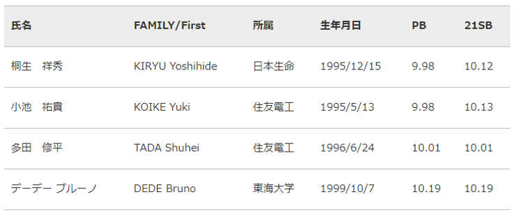 東京2020オリンピック日本代表の4選手がエントリー。2021年は4年ぶりに自己記録を更新し日本選手権では圧巻の走りで初優勝を飾った多田修平(住友電工)、日本人初の9秒台を樹立し今大会2連覇の期待がかかる桐生祥秀(日本生命)、日本人3人目の9秒台の自己ベストを持ち、2021年は200mで日本選手権初制覇を果たした小池祐貴(住友電工)、2021年日本選手権で100m・200m両種目で2位に入ったデーデー・ブルーノ(東海大学)が出場予定です。