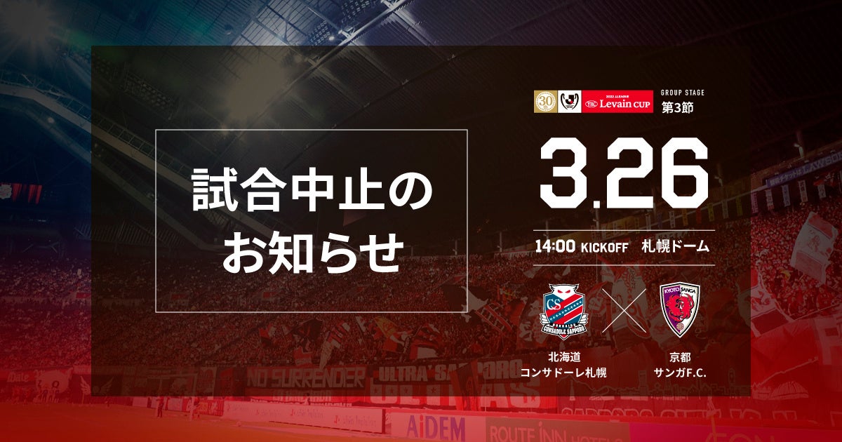 ◆京都サンガF.C.の選手・スタッフ複数名が新型コロナウイルス陽性判定となったことを受け、Jリーグ、京都サンガF.C.と協議をさせて頂き、3月26日(土)に予定しておりました、2022JリーグYBCルヴァンカップ グループステージ第3節 京都サンガF.C.戦 (14:00キックオフ / 札幌ドーム)の開催中止を決定しました。。