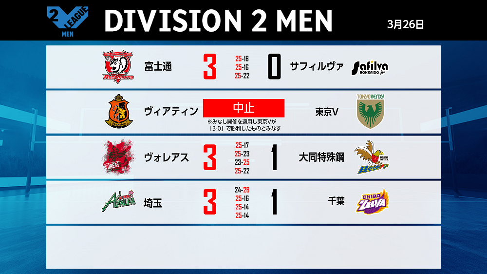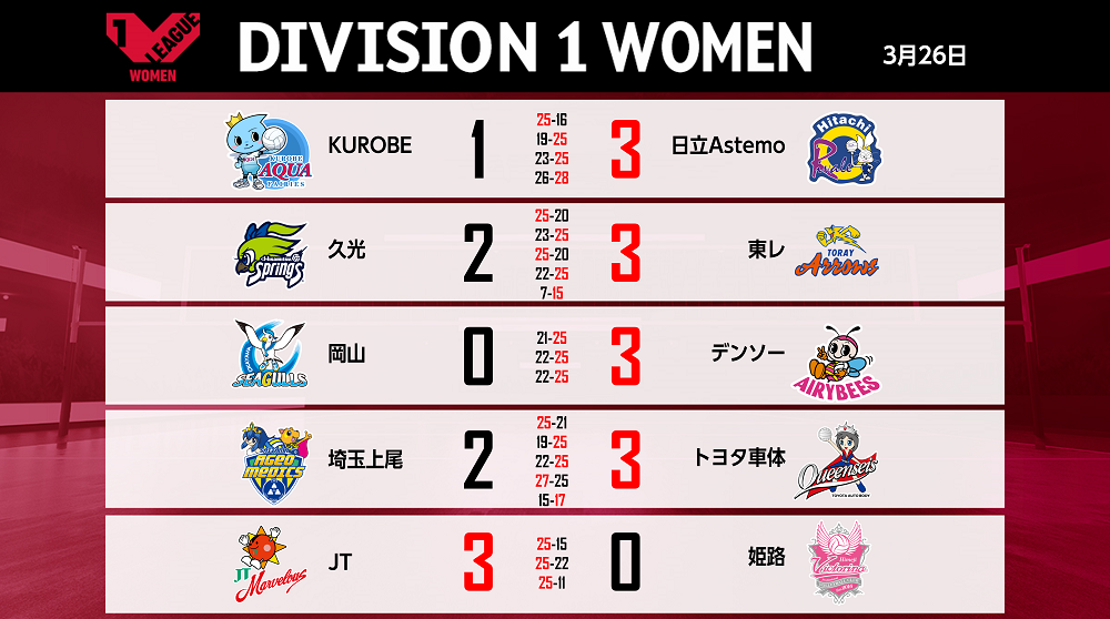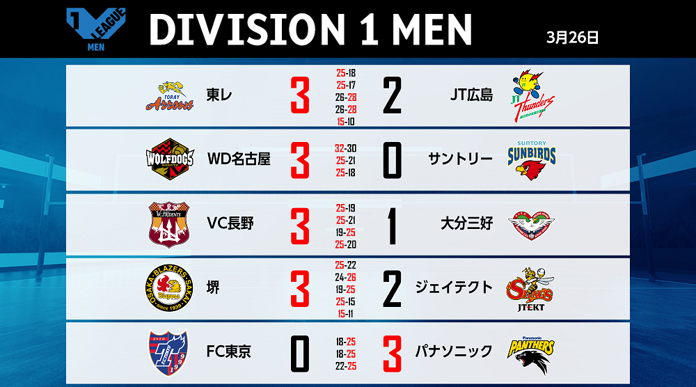 バレーボール国内最高峰リーグ V.LEAGUE【3月26日の試合結果】